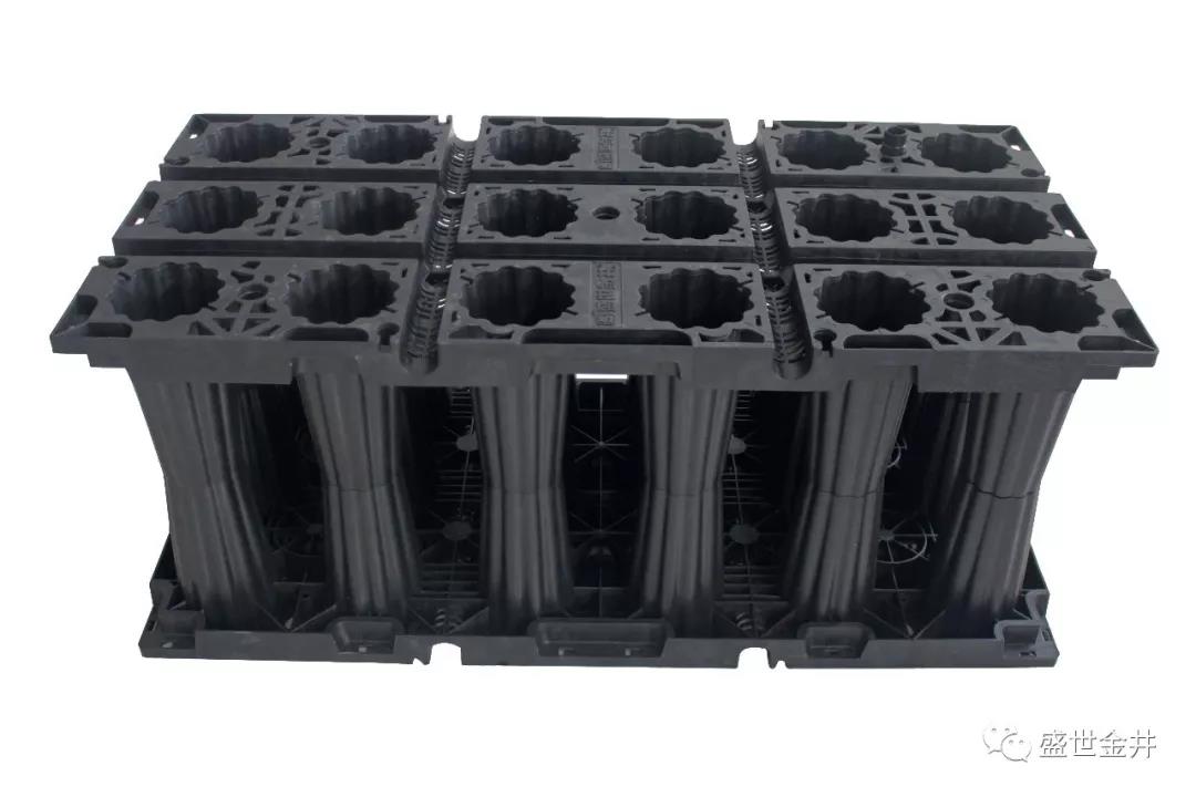 盛世金井雨水收集模塊是一種PP塑料,可埋于地下,用以收集雨水,再利用雨水。雨水蓄水模塊由相同規(guī)格尺寸的網(wǎng)格狀平板拼裝成模塊化的箱體,然后將每一個(gè)箱體碼放成為連續(xù)的雨水“矩陣”池。因?yàn)槠渚W(wǎng)格化透空的結(jié)構(gòu),材料的結(jié)構(gòu)占用空間不到5%,即模塊的蓄水空間達(dá)到95%以上,雨水可以在其中自由交換流動(dòng)。